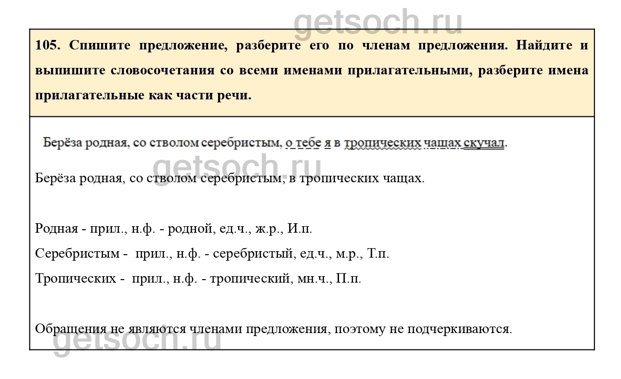 105. Спишите предложение, разберите его по членам предложения. Найдите и выпишите словосочетания со всеми именами прилагательными, разберите имена прилагательные как части речи.