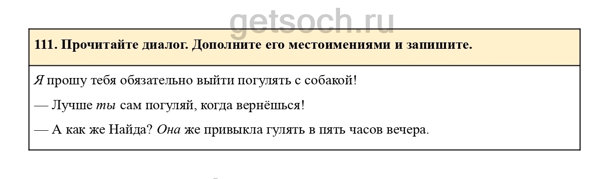 111. Прочитайте диалог. Дополните его местоимениями и запишите.