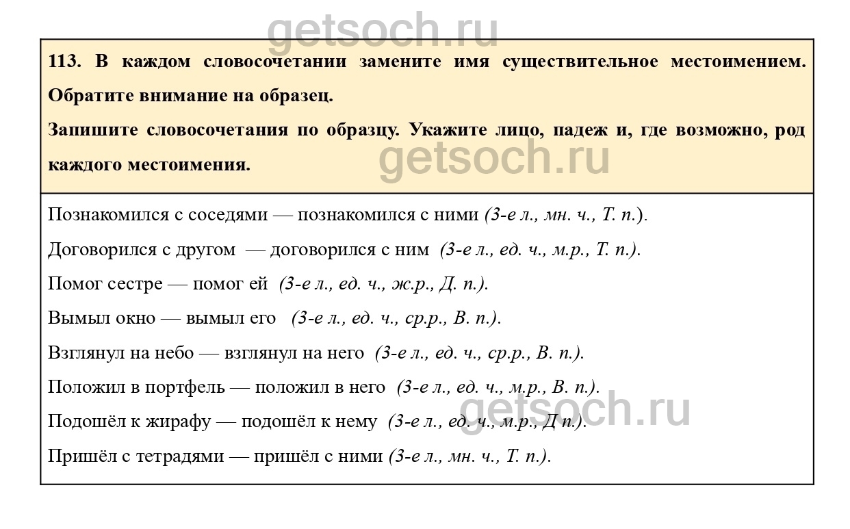 113. В каждом словосочетании замените имя существительное местоимением. Обратите внимание на образец.