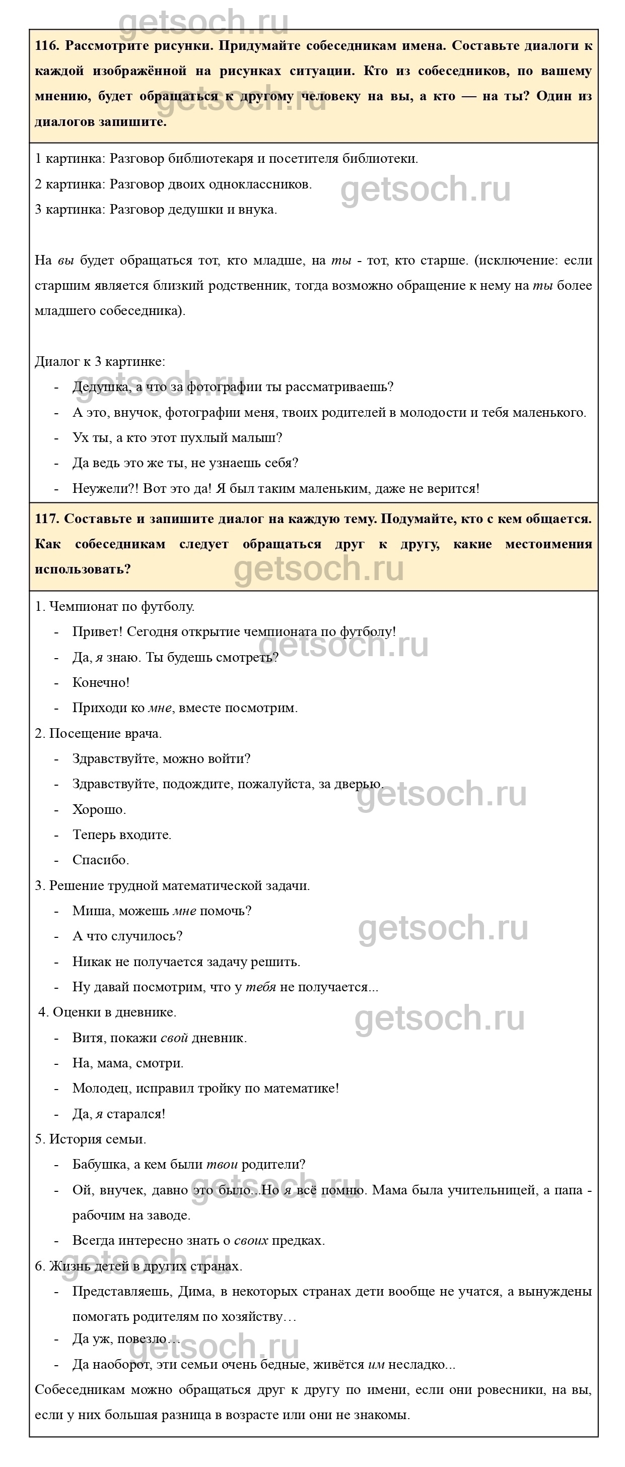 116. Рассмотрите рисунки. Придумайте собеседникам имена. Составьте диалоги к каждой изображённой на рисунках ситуации. Кто из собеседников, по вашему мнению, будет обращаться к другому человеку на вы, а кто — на ты? Один из диалогов запишите.