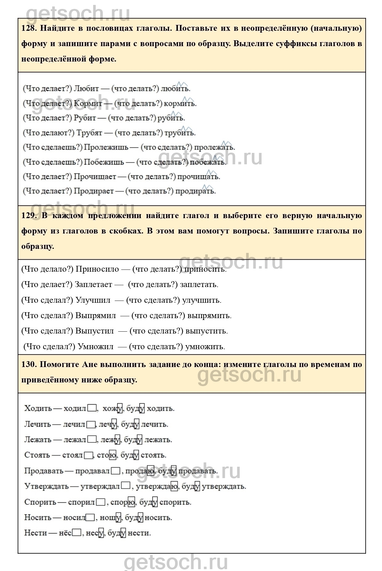 129. В каждом предложении найдите глагол и выберите его верную начальную форму из глаголов в скобках. В этом вам помогут вопросы. Запишите глаголы по образцу.