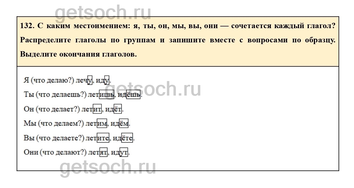 132. С каким местоимением: я, ты, он, мы, вы, они — сочетается каждый глагол? Распределите глаголы по группам и запишите вместе с вопросами по образцу. Выделите окончания глаголов.