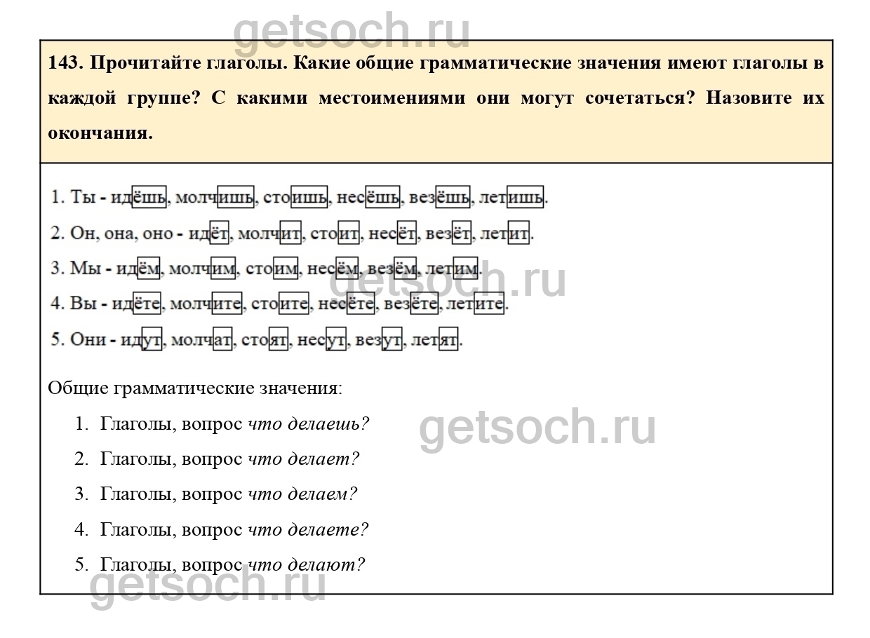 143. Прочитайте глаголы. Какие общие грамматические значения имеют глаголы в каждой группе? С какими местоимениями они могут сочетаться? Назовите их окончания.