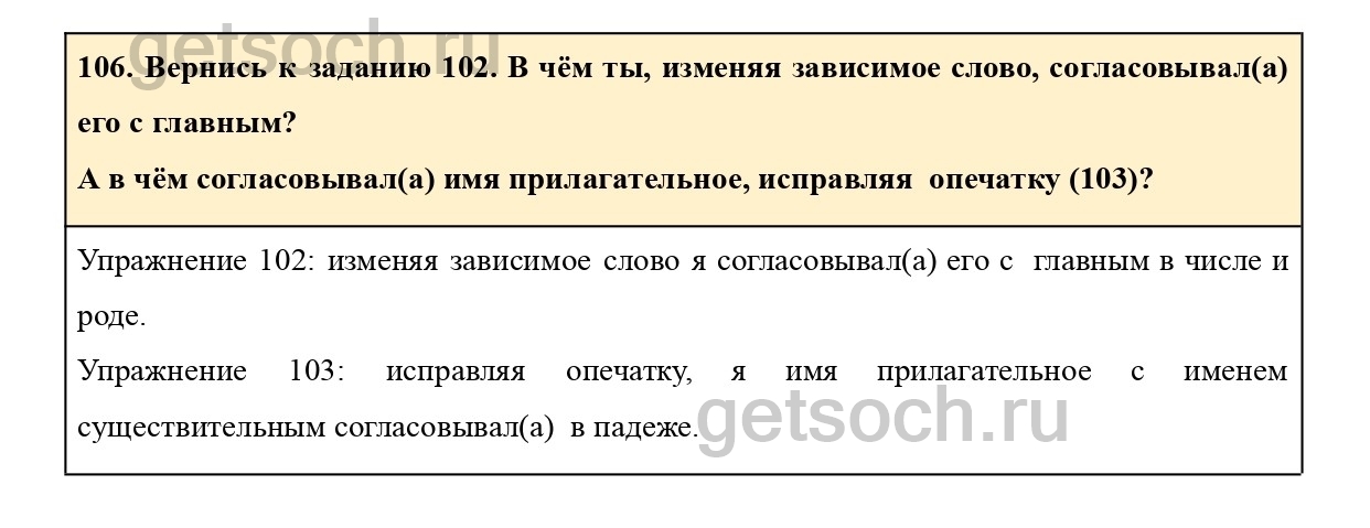 106. Вернись к заданию 102. В чём ты, изменяя зависимое слово, согласовывал(а) его с главным?