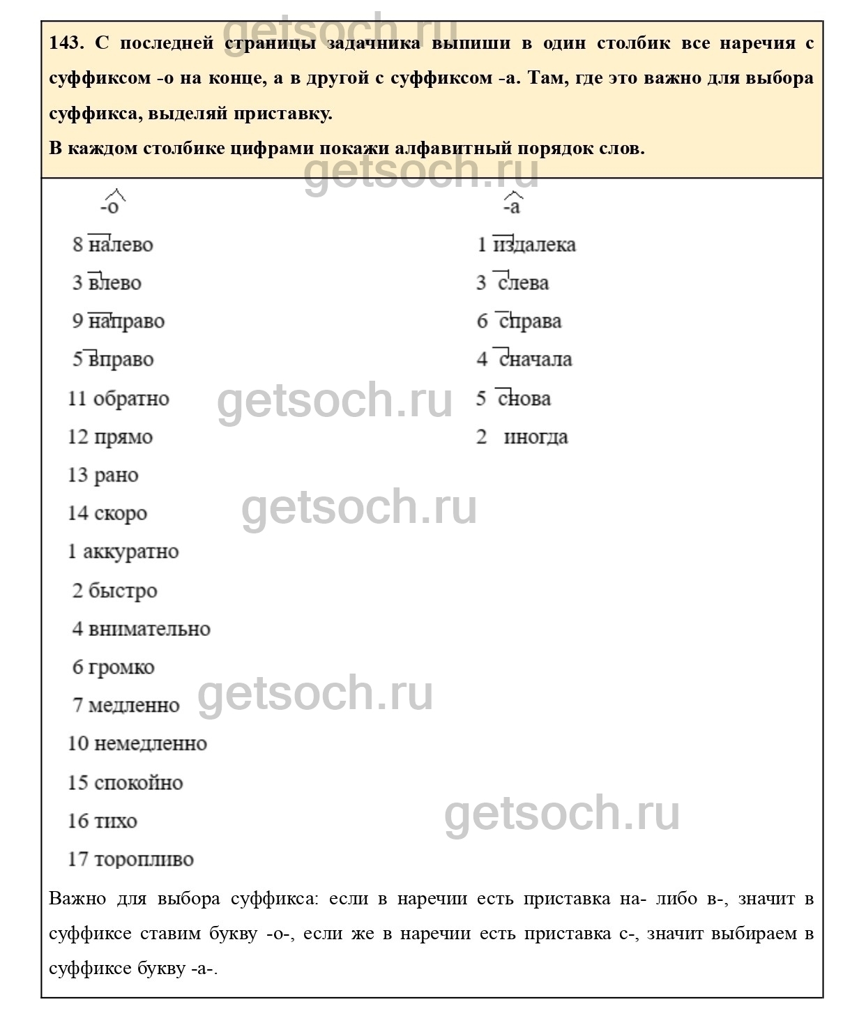 143. С последней страницы задачника выпиши в один столбик все наречия с суффиксом -о на конце, a в другой с суффиксом -а. Там, где это важно для выбора суффикса, выделяй приставку.
