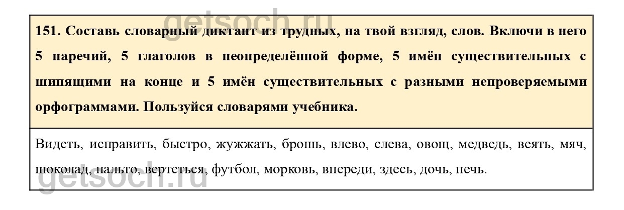 151. Составь словарный диктант из трудных, на твой взгляд, слов. Включи в него 5 наречий, 5 глаголов в неопределённой форме, 5 имён существительных с шипящими на конце и 5 имён существительных с разными непроверяемыми орфограммами. Пользуйся словарями учебника.