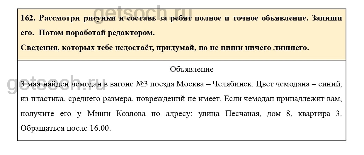162. Рассмотри рисунки и составь за ребят полное и точное объявление. Запиши его. Потом поработай редактором.