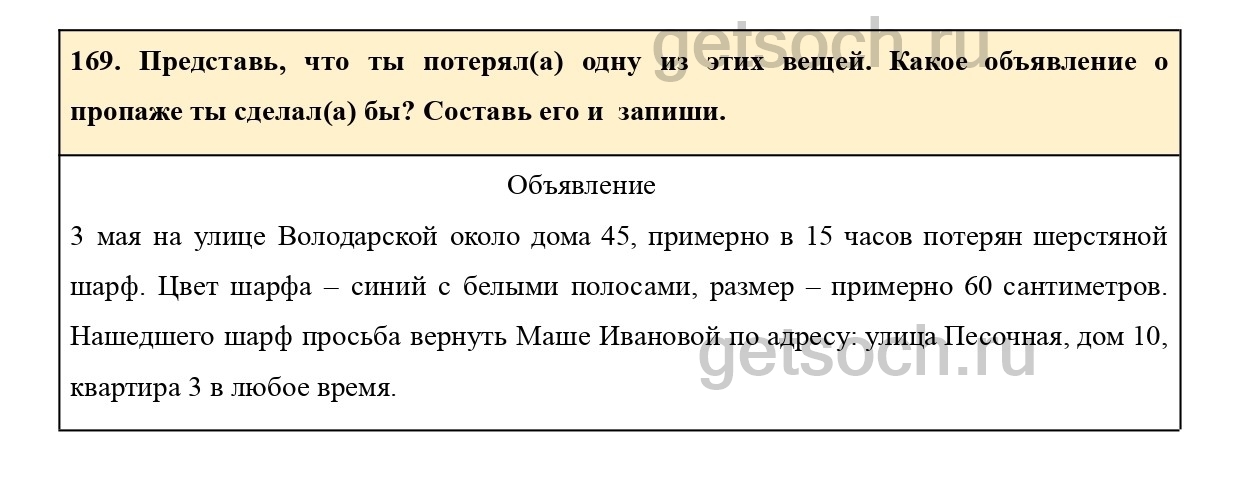 169. Представь, что ты потерял(а) одну из этих вещей. Какое объявление о пропаже ты сделал(а) бы? Составь его и запиши.