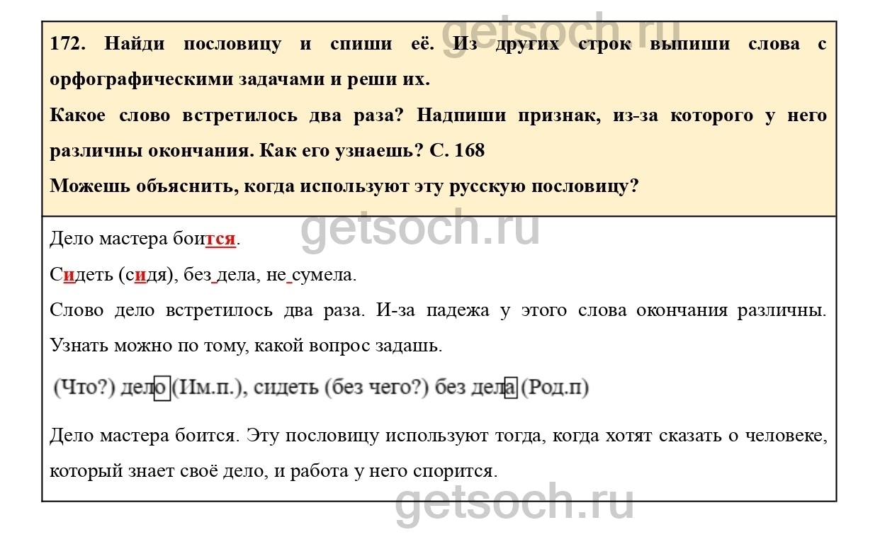 Какое слово встретилось два раза? Надпиши признак, из-за которого у него различны окончания. Как его узнаешь? С. 168