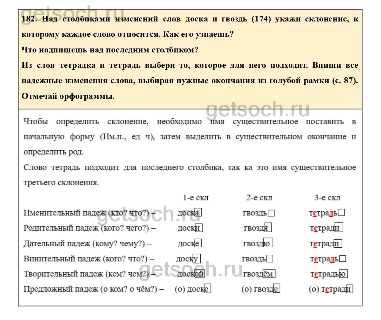 182. Над столбиками изменений слов доска и гвоздь (174) укажи склонение, к которому каждое слово относится. Как его узнаешь?