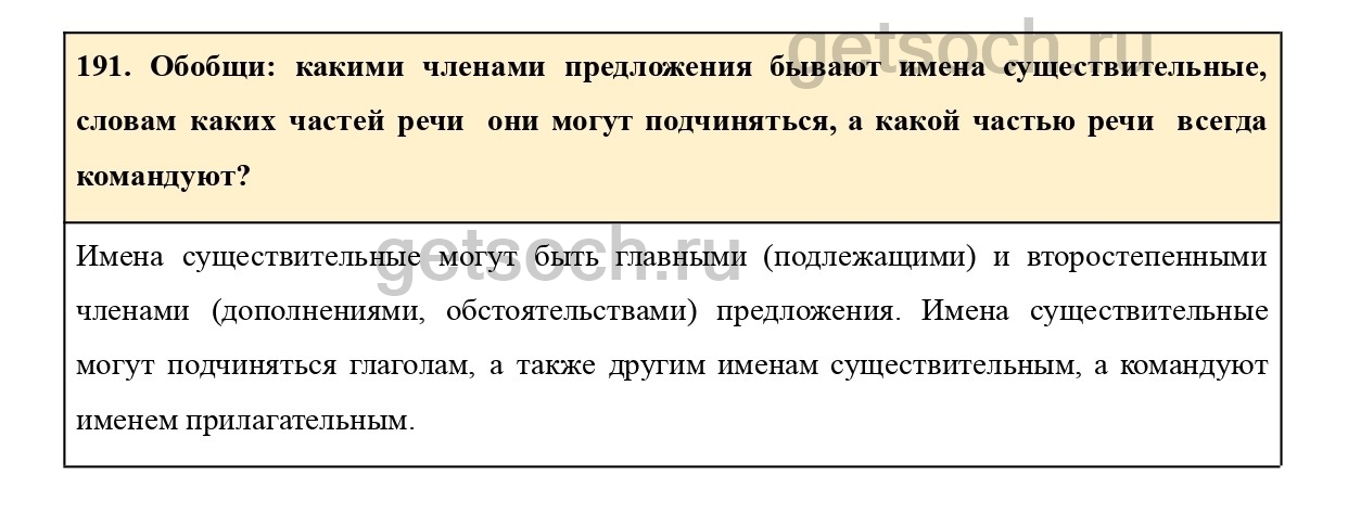 191. Обобщи: какими членами предложения бывают имена существительные, словам каких частей речи они могут подчиняться, а какой частью речи всегда командуют?