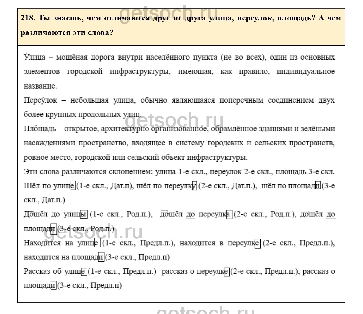218. Ты знаешь, чем отличаются друг от друга улица, переулок, площадь? А чем различаются эти слова?