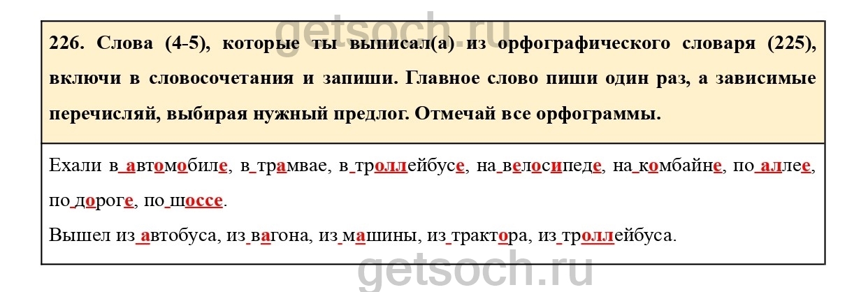 226. Слова (4-5), которые ты выписал(а) из орфографического словаря (225), включи в словосочетания и запиши. Главное слово пиши один раз, a зависимые перечисляй, выбирая нужный предлог. Отмечай все орфограммы.