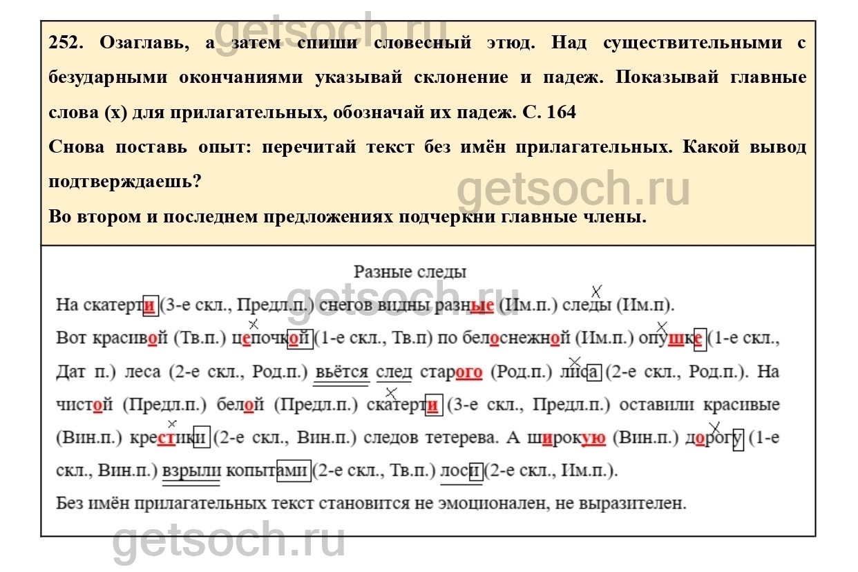 252. Озаглавь, а затем спиши словесный этюд. Над существительными с безударными окончаниями указывай склонение и падеж. Показывай главные слова (х) для прилагательных, обозначай их падеж. С. 164