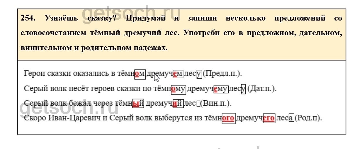 254. Узнаёшь сказку? Придумай и запиши несколько предложений со словосочетанием тёмный дремучий лес. Употреби его в предложном, дательном, винительном и родительном падежах.