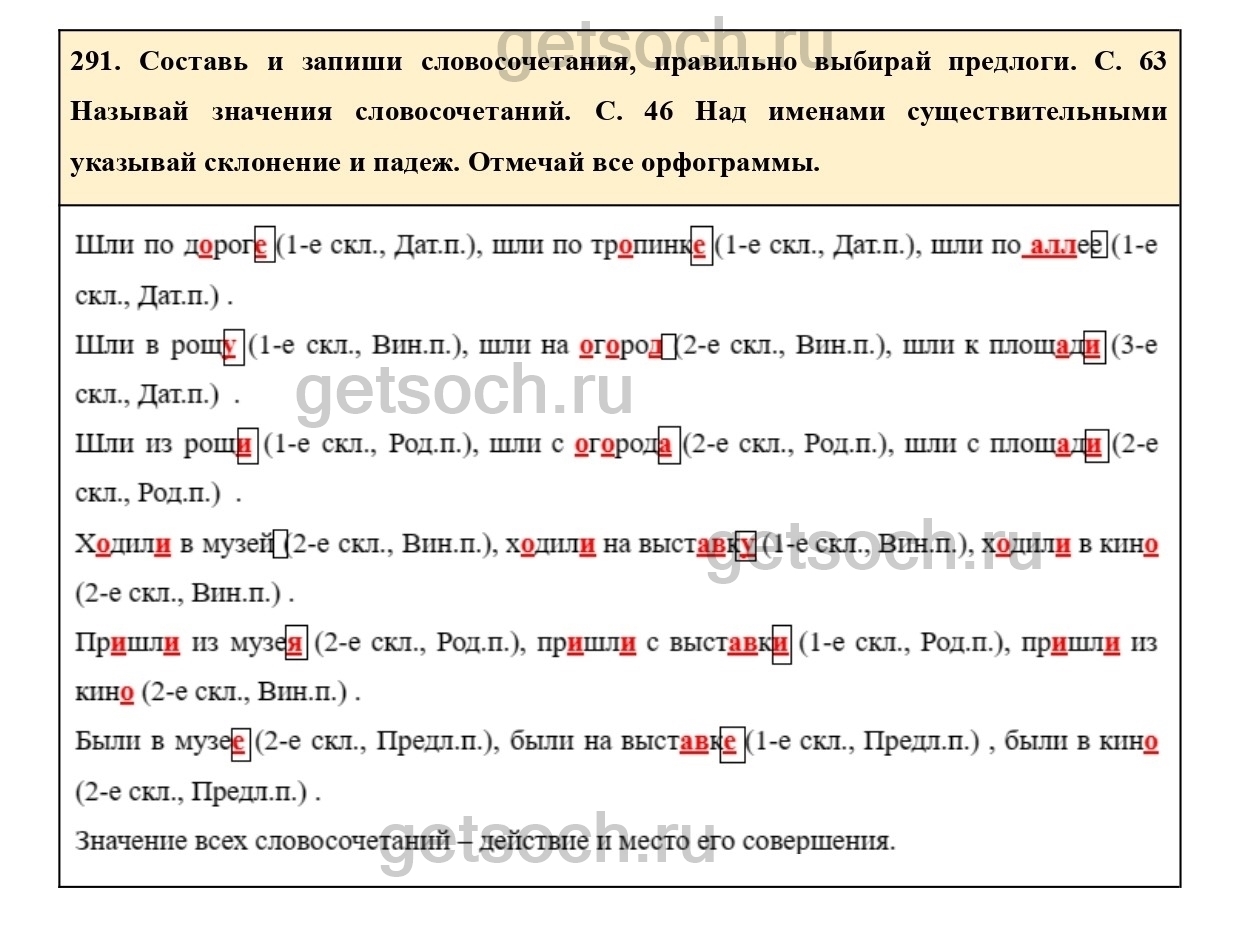 291. Составь и запиши словосочетания, правильно выбирай предлоги. С. 63 Называй значения словосочетаний. С. 46 Над именами существительными указывай склонение и падеж. Отмечай все орфограммы.