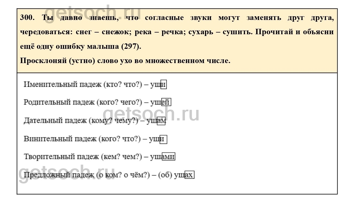300. Ты давно знаешь, что согласные звуки могут заменять друг друга, чередоваться: снег – снежок; река – речка; сухарь – сушить. Прочитай и объясни ещё одну ошибку малыша (297).