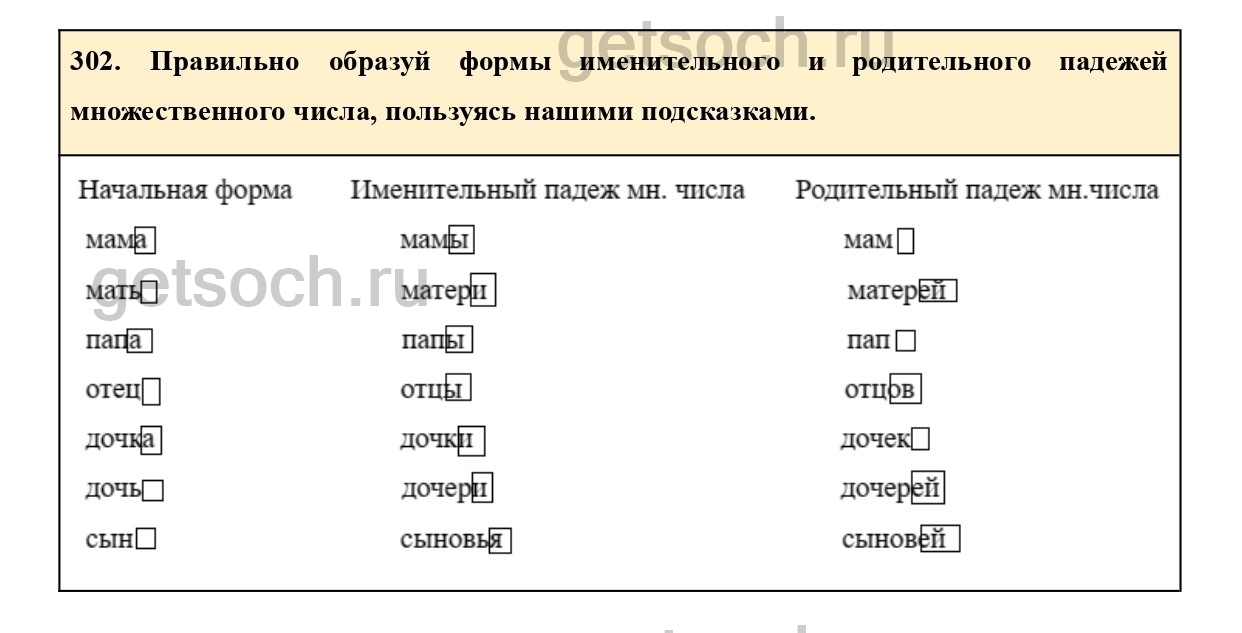 302. Правильно образуй формы именительного и родительного падежей множественного числа, пользуясь нашими подсказками.