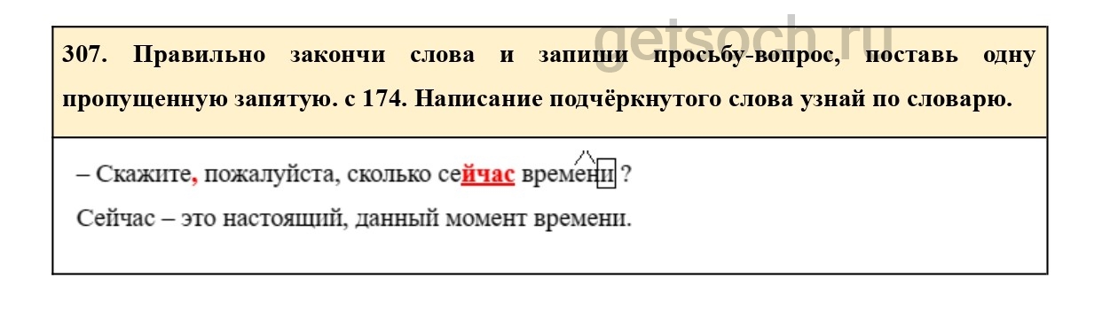 307. Правильно закончи слова и запиши просьбу-вопрос, поставь одну пропущенную запятую. с 174. Написание подчёркнутого слова узнай по словарю.