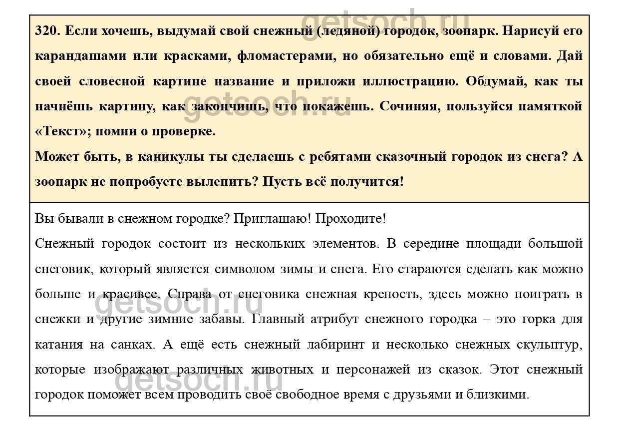 320. Если хочешь, выдумай свой снежный (ледяной) городок, зоопарк. Нарисуй его карандашами или красками, фломастерами, но обязательно ещё и словами. Дай своей словесной картине название и приложи иллюстрацию. Обдумай, как ты начнёшь картину, как закончишь, что покажешь. Сочиняя, пользуйся памяткой «Текст»; помни о проверке.