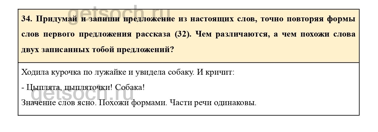 34. Придумай и запиши предложение из настоящих слов, точно повторяя формы слов первого предложения рассказа (32). Чем различаются, a чем похожи слова двух записанных тобой предложений?