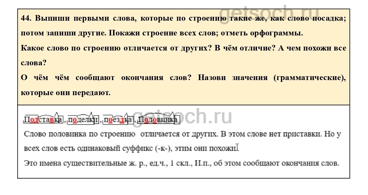 44. Выпиши первыми слова, которые по строению такие же, как слово посадка; потом запиши другие. Покажи строение всex слов; отметь орфограммы.