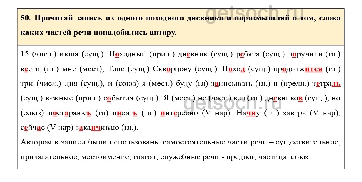 50. Прочитай запись из одного походного дневника и поразмышляй о том, слова каких частей речи понадобились автору.