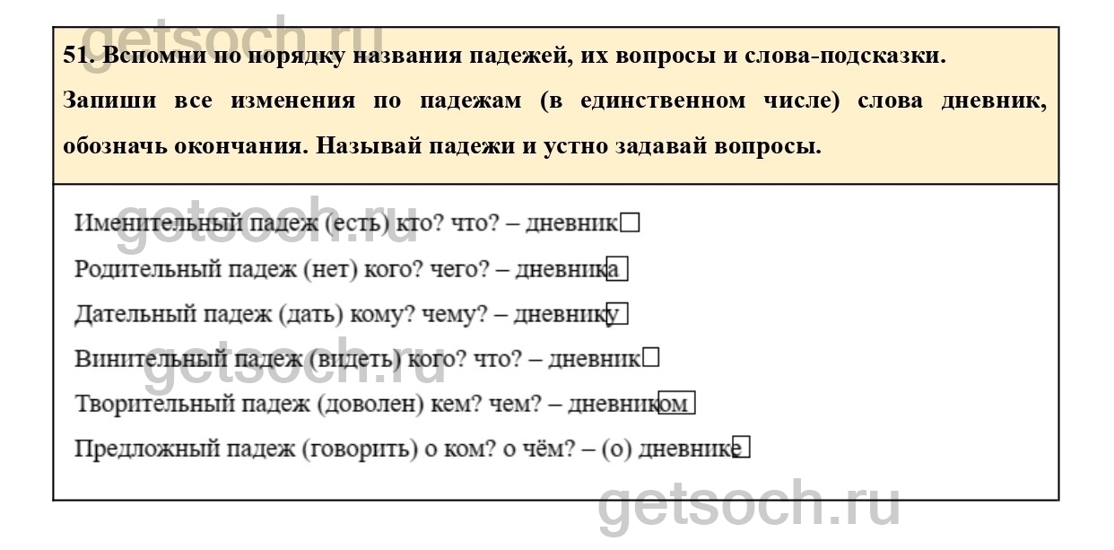 Запиши все изменения по падежам (в единственном числе) слова дневник, обозначь окончания. Называй падежи и устно задавай вопросы.