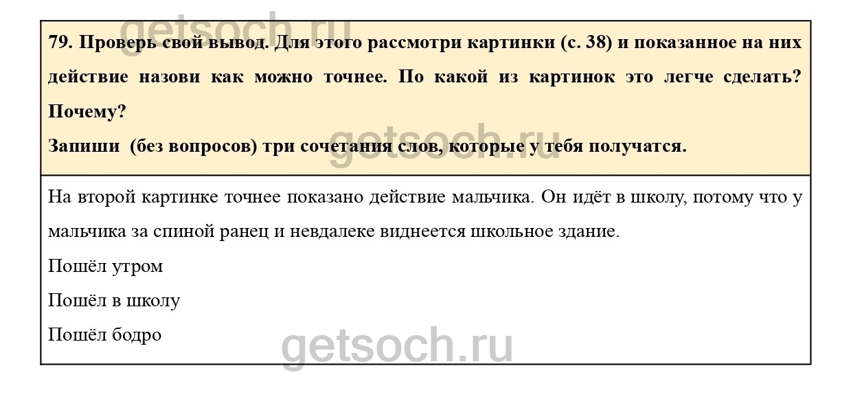 79. Проверь свой вывод. Для этого рассмотри картинки (с. 38) и показанное на них действие назови как можно точнее. По какой из картинок это легче сделать? Почему?