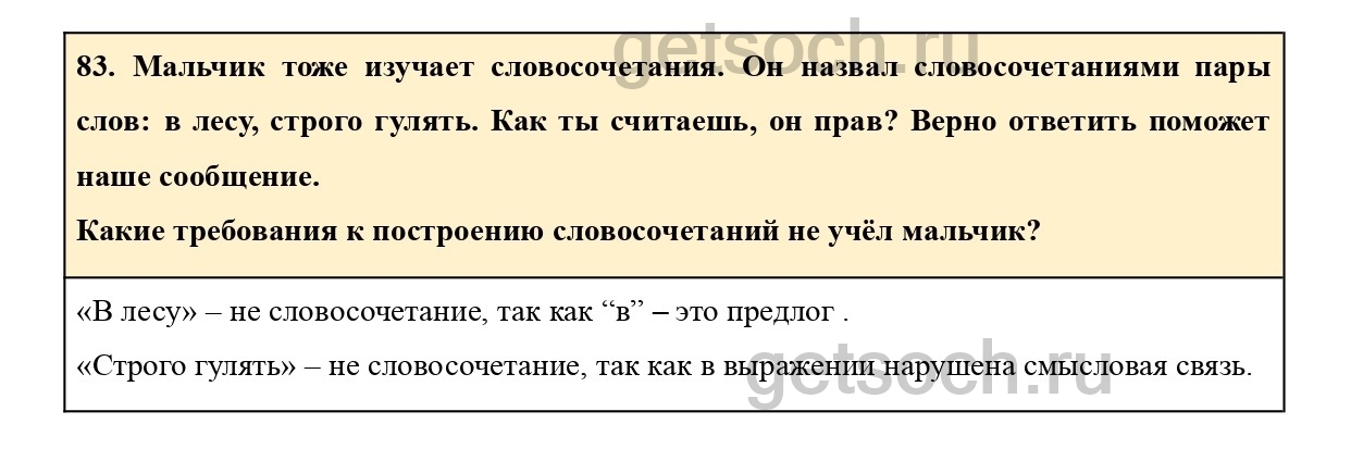 83. Мальчик тоже изучает словосочетания. Он назвал словосочетаниями пары слов: в лесу, строго гулять. Как ты считаешь, он прав? Верно ответить поможет наше сообщение.