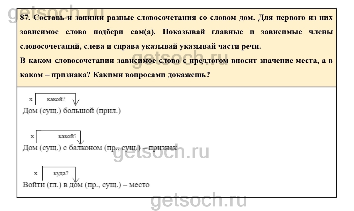 87. Составь и запиши разные словосочетания со словом дом. Для первого из них зависимое слово подбери сам(а). Показывай главные и зависимые члены словосочетаний, слева и справа указывай указывай части речи.