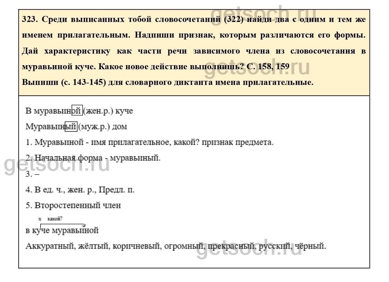 323. Среди выписанных тобой словосочетаний (322) найди два с одним и тем же именем прилагательным. Надпиши признак, которым различаются его формы. Дай характеристику как части речи зависимого члена из словосочетания в муравьиной куче. Какое новое действие выполнишь? С. 158, 159