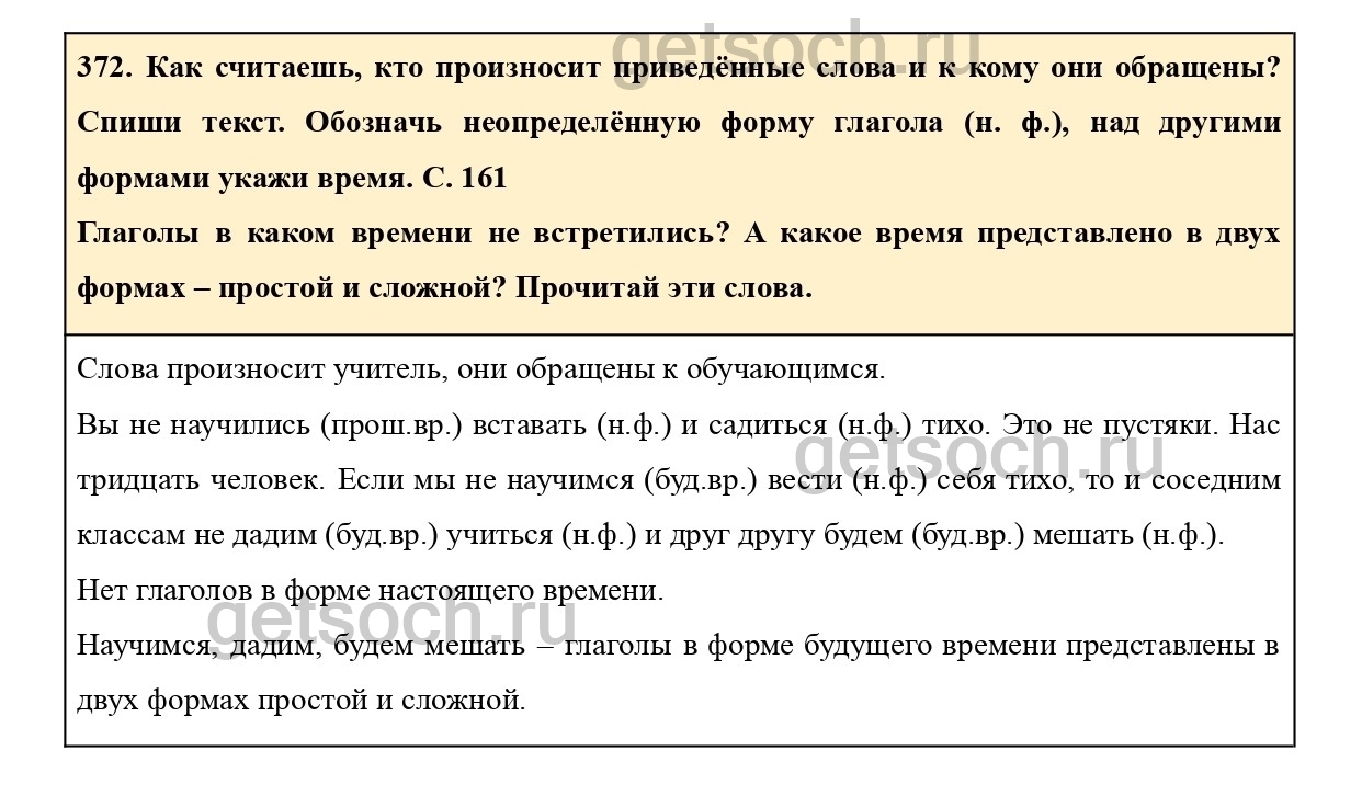 372. Как считаешь, кто произносит приведённые слова и к кому они обращены? Спиши текст. Обозначь неопределённую форму глагола (н. ф.), над другими формами укажи время. C. 161