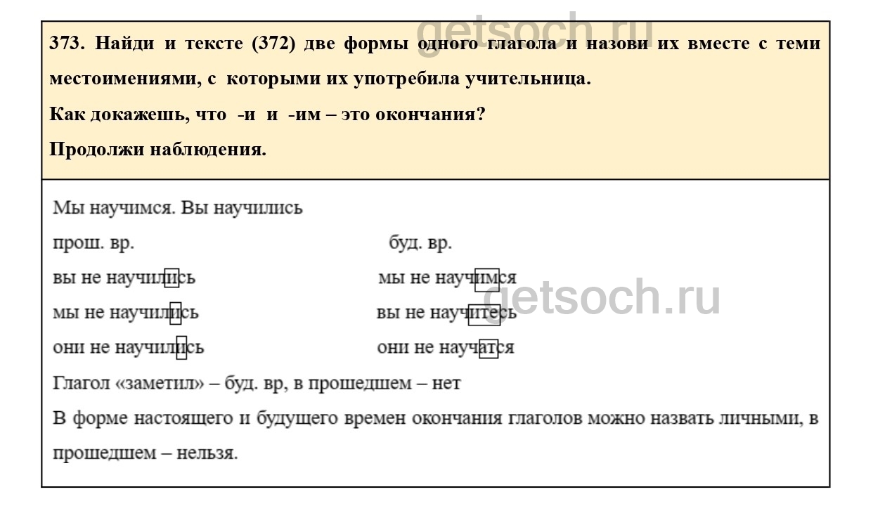 373. Найди и тексте (372) две формы одного глагола и назови их вместе с теми местоимениями, с которыми их употребила учительница.