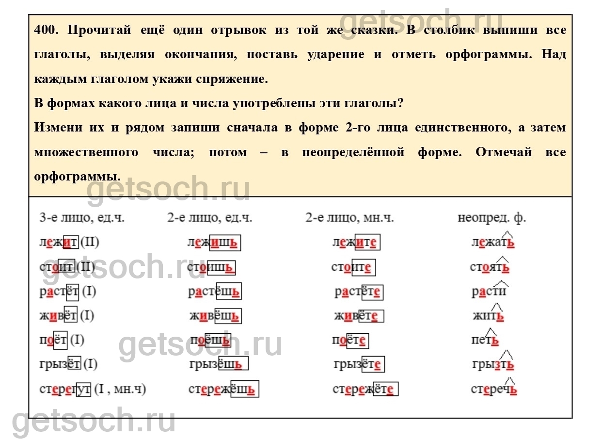 400. Прочитай ещё один отрывок из той же сказки. B столбик выпиши все глаголы, выделяя окончания, поставь ударение и отметь орфограммы. Над каждым глаголом укажи спряжение.