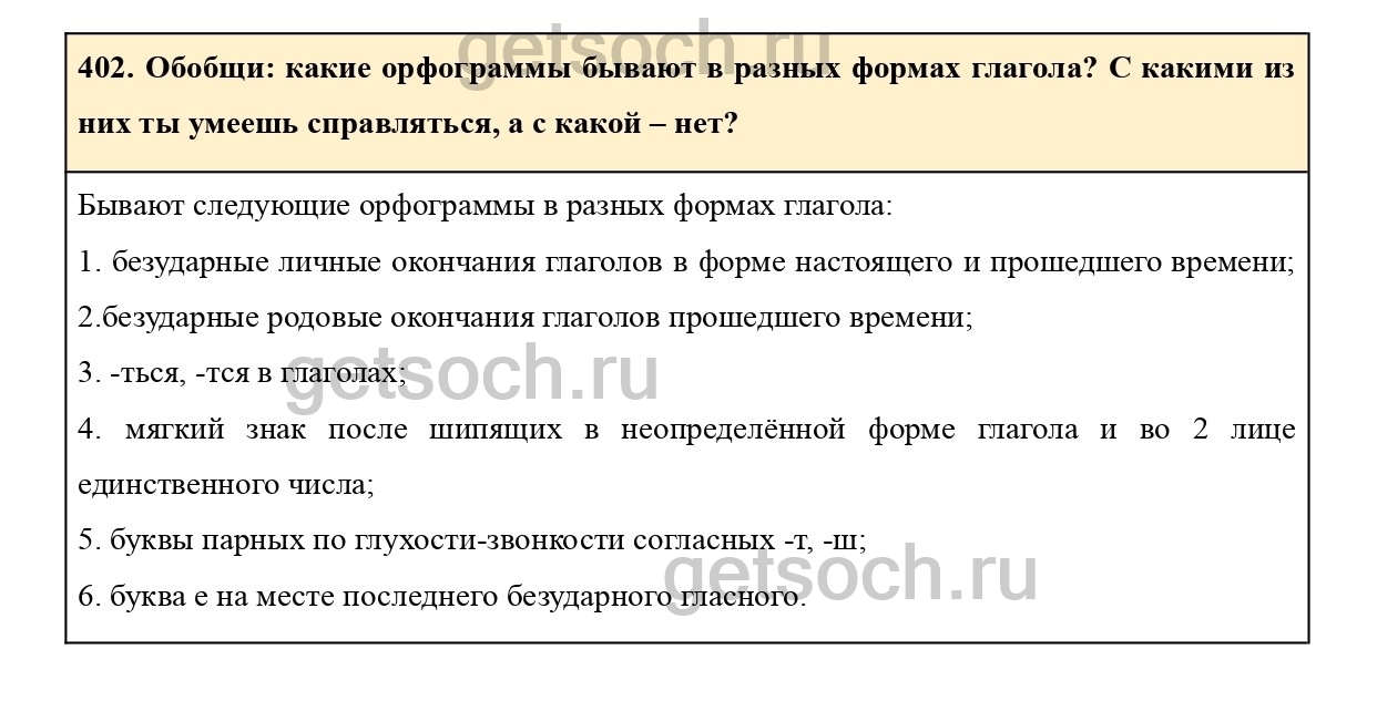 402. Обобщи: какие орфограммы бывают в разных формах глагола? С какими из них ты умеешь справляться, a c какой – нет?