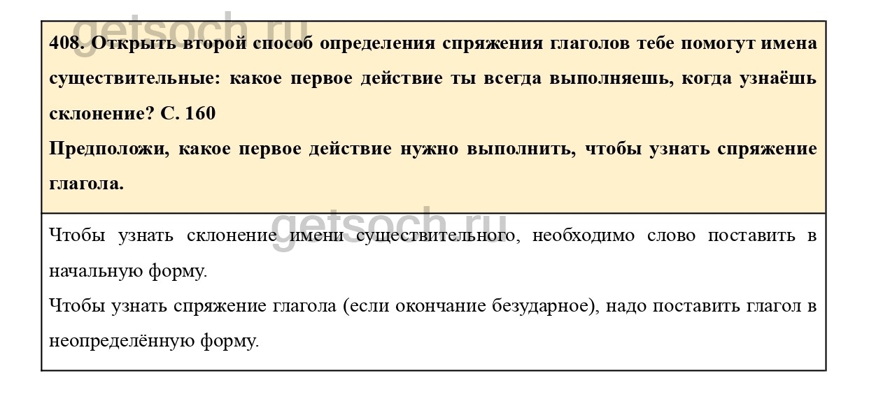 408. Открыть второй способ определения спряжения глаголов тебе помогут имена существительные: какое первое действие ты всегда выполняешь, когда узнаёшь склонение? С. 160