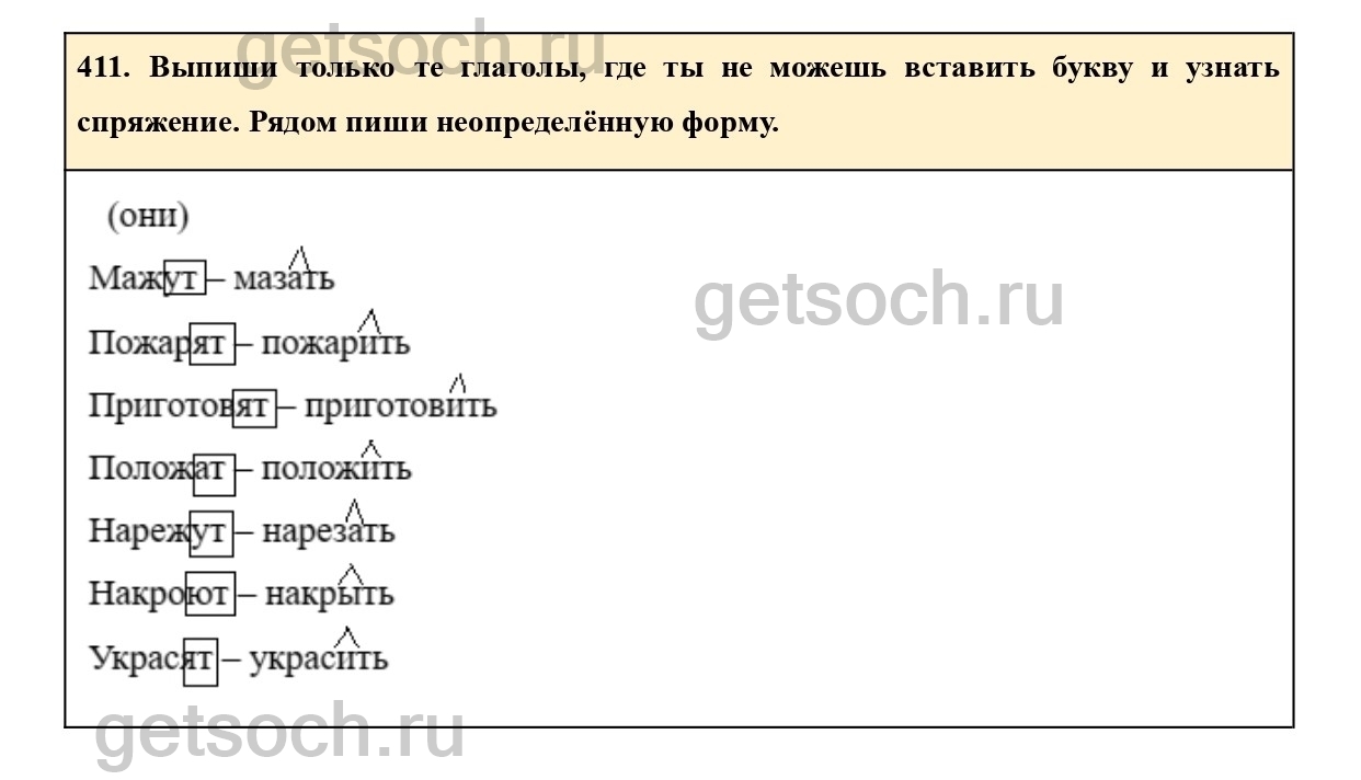 411. Выпиши только те глаголы, где ты не можешь вставить букву и узнать спряжение. Рядом пиши неопределённую форму.
