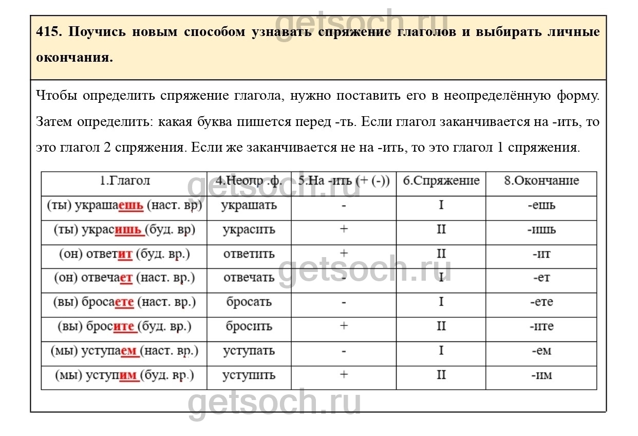 415. Поучись новым способом узнавать спряжение глаголов и выбирать личные окончания.