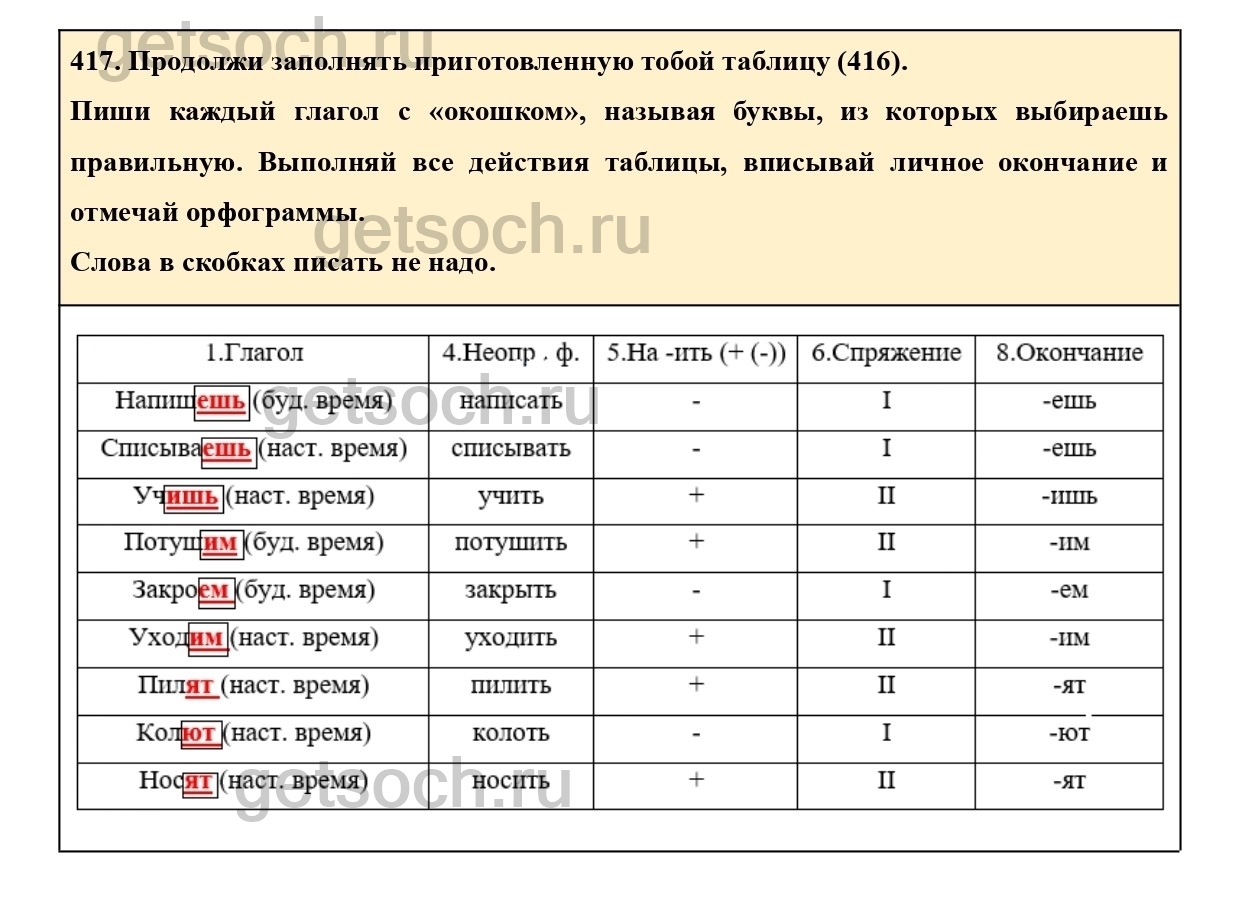 Пиши каждый глагол с «окошком», называя буквы, из которых выбираешь правильную. Выполняй все действия таблицы, вписывай личное окончание и отмечай орфограммы.