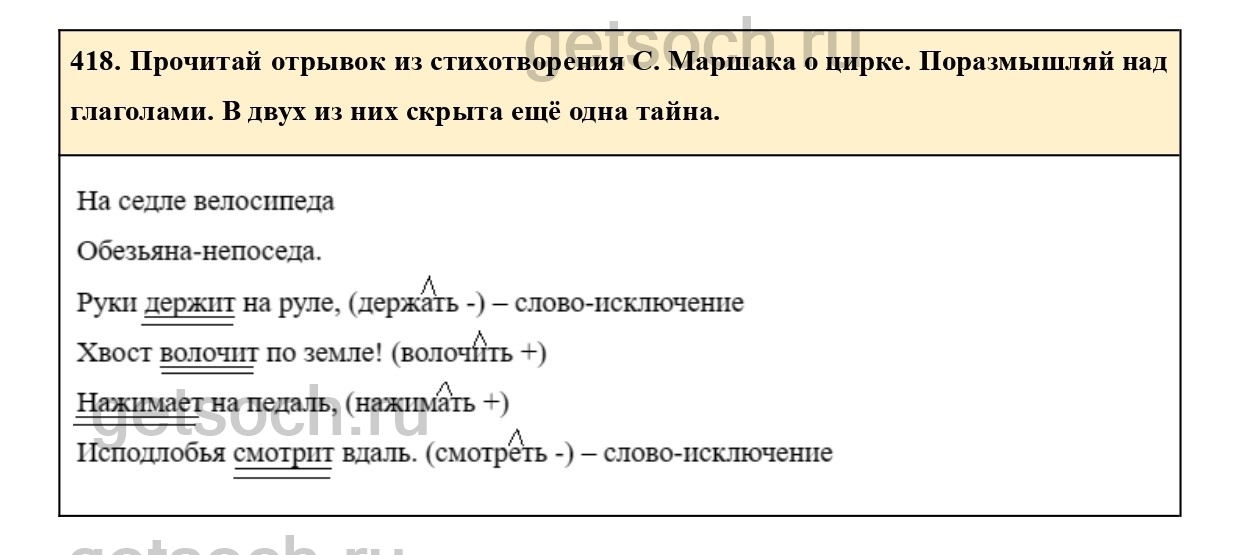 418. Прочитай отрывок из стихотворения С. Маршака о цирке. Поразмышляй над глаголами. В двух из них скрыта ещё одна тайна.