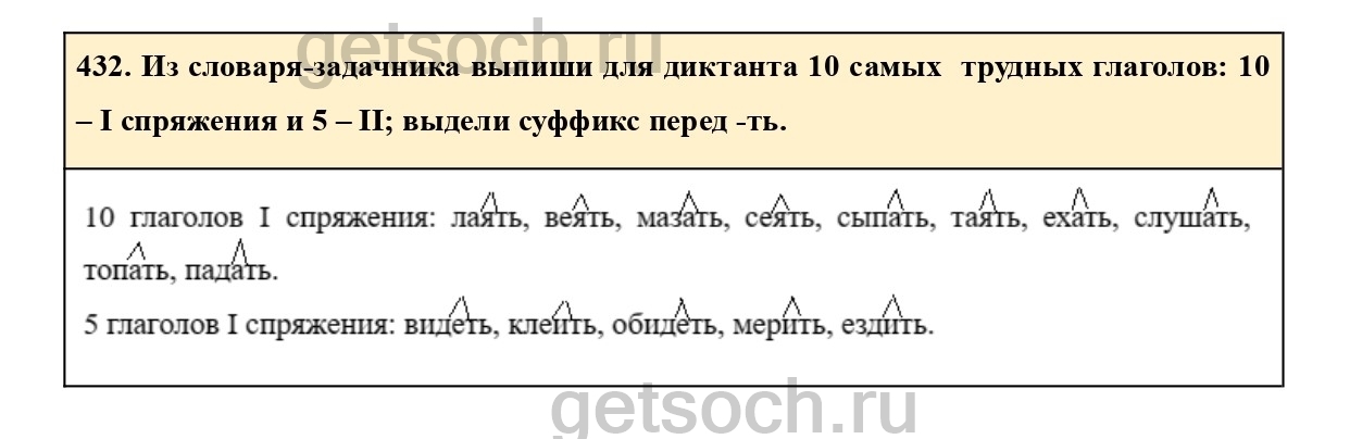 432. Из словаря-задачника выпиши для диктанта 10 самых трудных глаголов: 10 – I спряжения и 5 – II; выдели суффикс перед -ть.