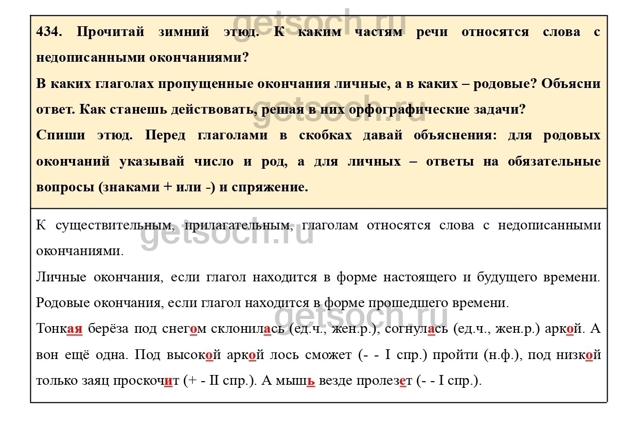 434. Прочитай зимний этюд. К каким частям речи относятся слова с недописанными окончаниями?