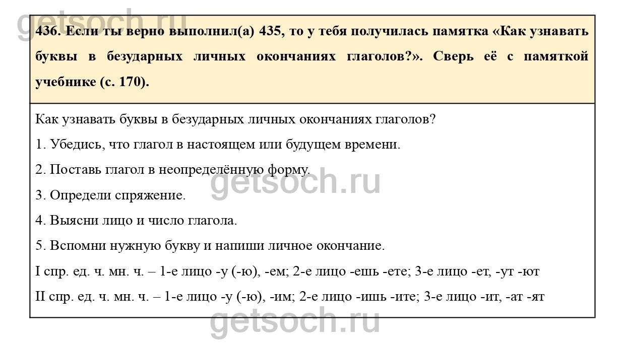 436. Если ты верно выполнил(а) 435, то у тебя получилась памятка «Как узнавать буквы в безударных личных окончаниях глаголов?». Сверь её с памяткой учебнике (с. 170).