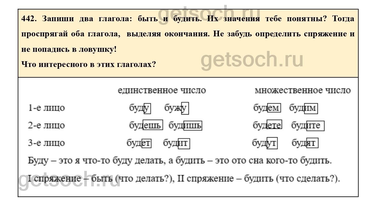 442. Запиши два глагола: быть и будить. Их значения тебе понятны? Тогда проспрягай оба глагола, выделяя окончания. Не забудь определить спряжение и не попадись в ловушку!