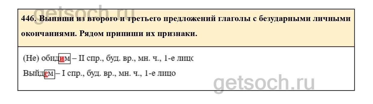 446. Выпиши из второго и третьего предложений глаголы с безударными личными окончаниями. Рядом припиши их признаки.