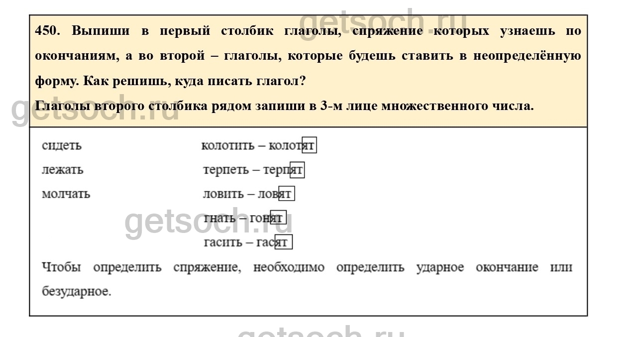 450. Выпиши в первый столбик глаголы, спряжение которых узнаешь по окончаниям, a во второй – глаголы, которые будешь ставить в неопределённую форму. Как решишь, куда писать глагол?