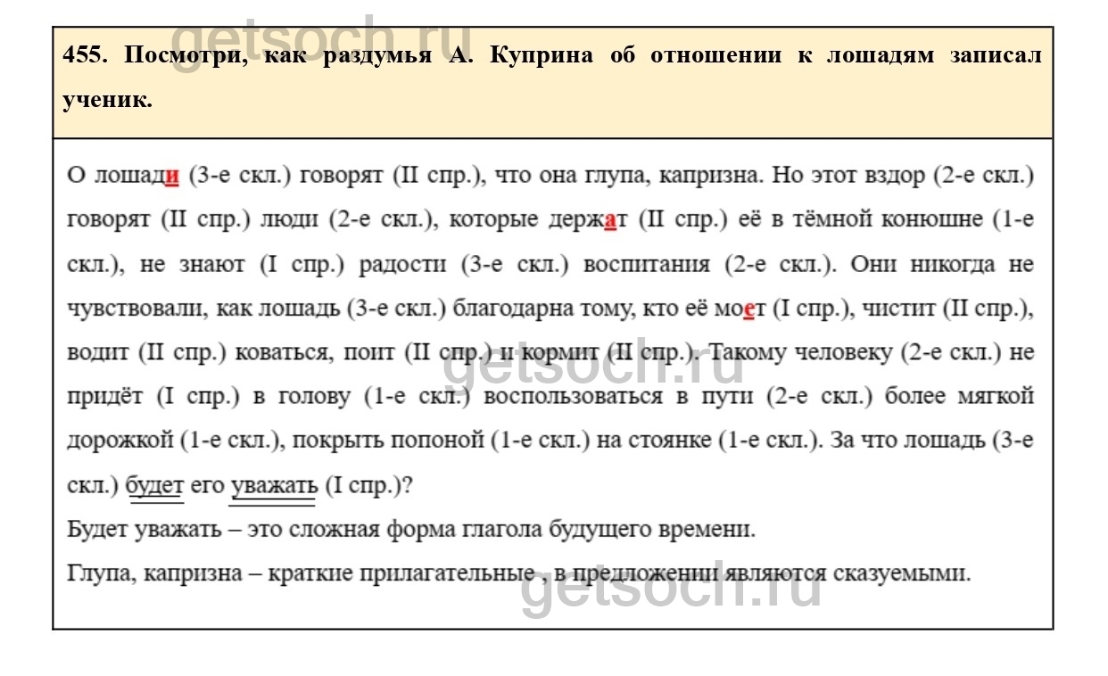 455. Посмотри, как раздумья А. Куприна об отношении к лошадям записал ученик.