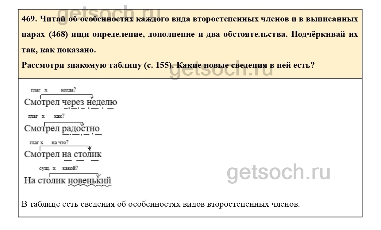 469. Читай об особенностях каждого вида второстепенных членов и в выписанных парах (468) ищи определение, дополнение и два обстоятельства. Подчёркивай их так, как показано.