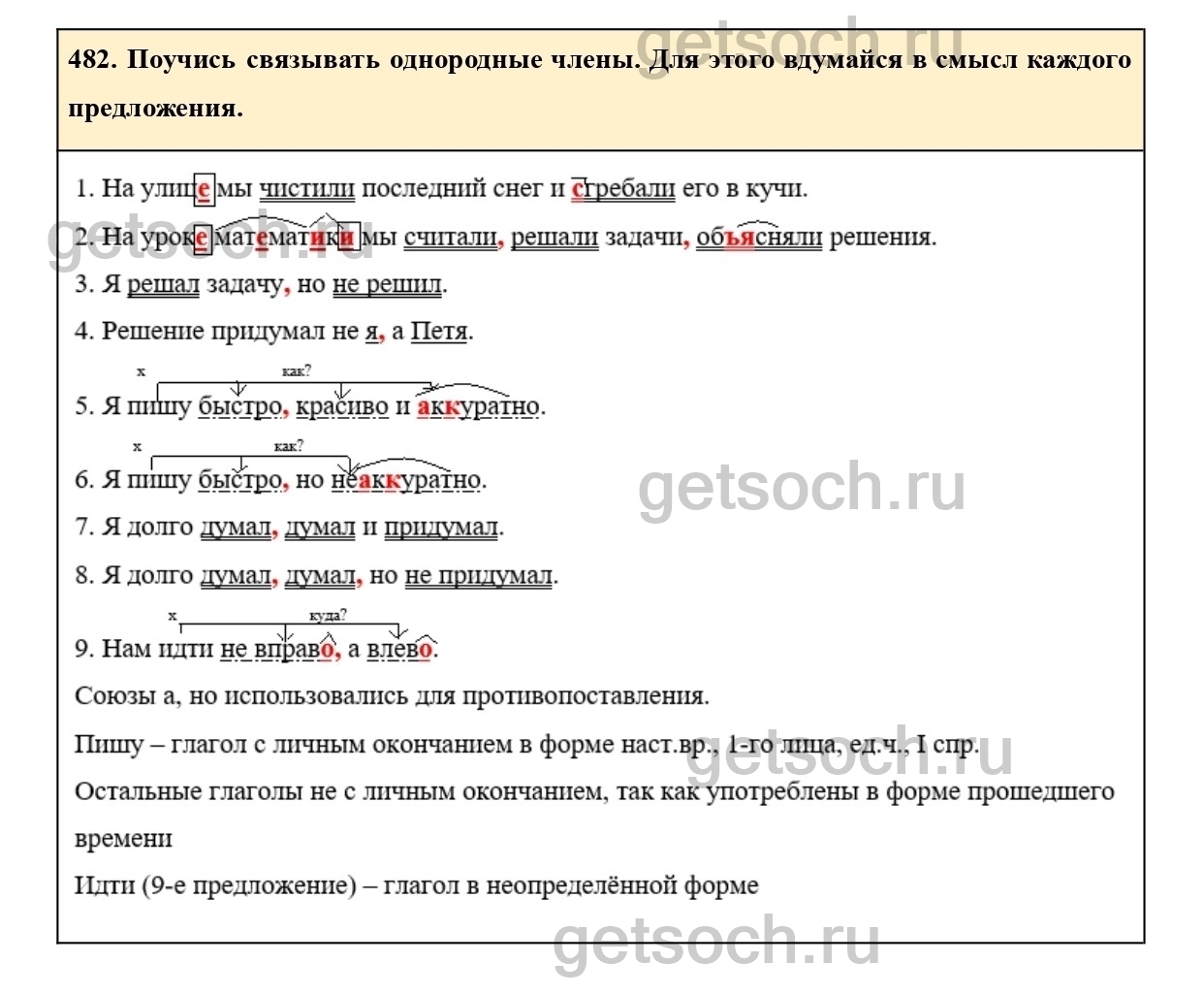 482. Поучись связывать однородные члены. Для этого вдумайся в смысл каждого предложения.